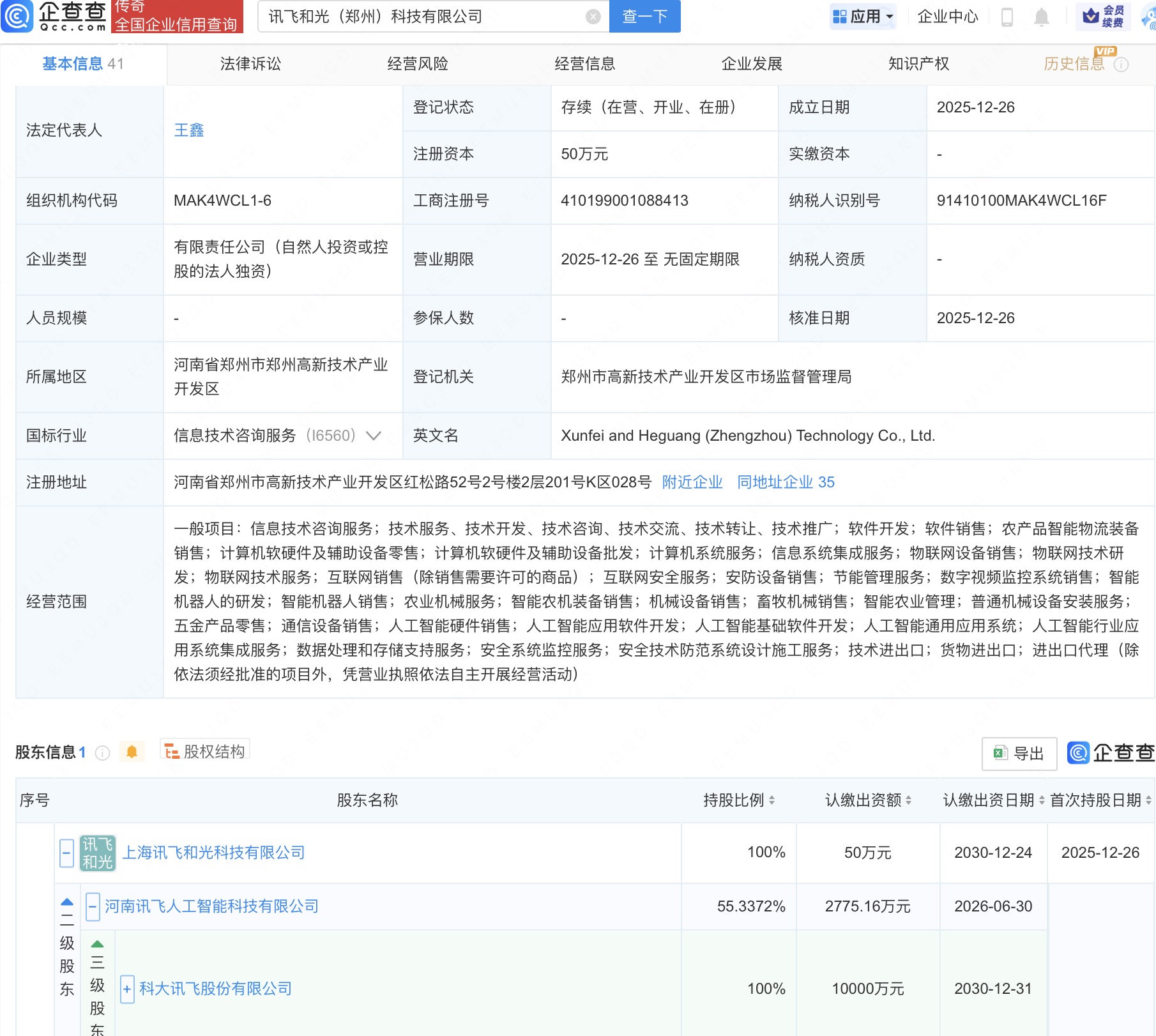 近日,讯飞和光(郑州)科技有限公司成立,法定代表人为王鑫,经营范围含物联网设备销售、智能机器人的研发、人工智能应用软件开发、人工智能基础软件开发、人工智能通用应用系统等。企查查股权穿透显示,该公司由科大讯飞(002230)旗下上海讯飞和光科技有限公司全资持股。