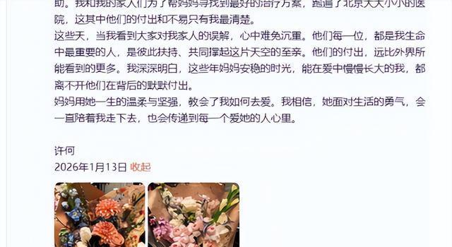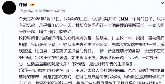 何晴去世一个月后,儿子许何终于发声,情真意切、字字催泪。